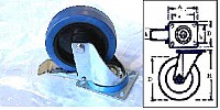 Realizzata in gomma elastica blu , con supporto medio zincato , scorrevole su boccola. Ruota BLU Elastica con freno direzionale ( blocca sia la rotazione del supporto che la rotazione della ruota) _D.1250 mm x b.38 mm, altezza H 155 mm, Dimensioni piastra A 100 mm x B 85 mm. Interasse asole di fissaggio a 80 mm x 60 mm. Portata Kg. 150.