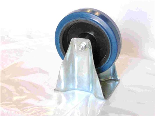 Realizzata in gomma elastica blu , con supporto industriale zincato , scorrevole su boccola. Ruota BLU Elastica _D.100 mm x b.35 mm, altezza H 110 mm, Dimensioni piastra A 100 mm x B 85 mm. Interasse asole di fissaggio a 80 mm x 60 mm. Portata Kg. 120